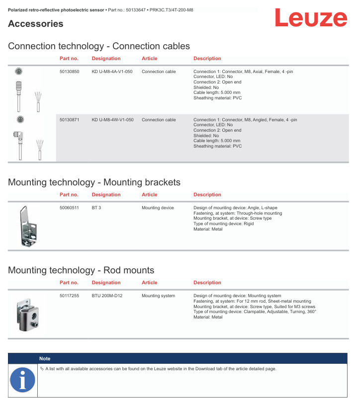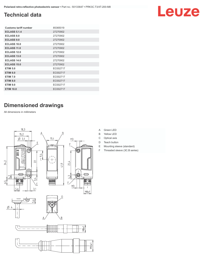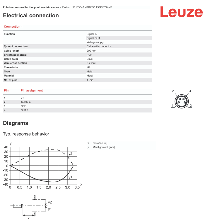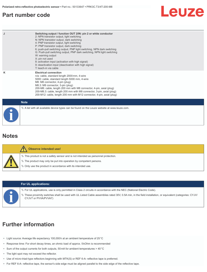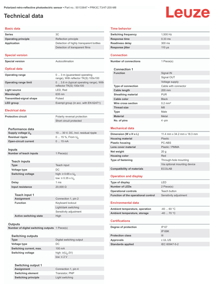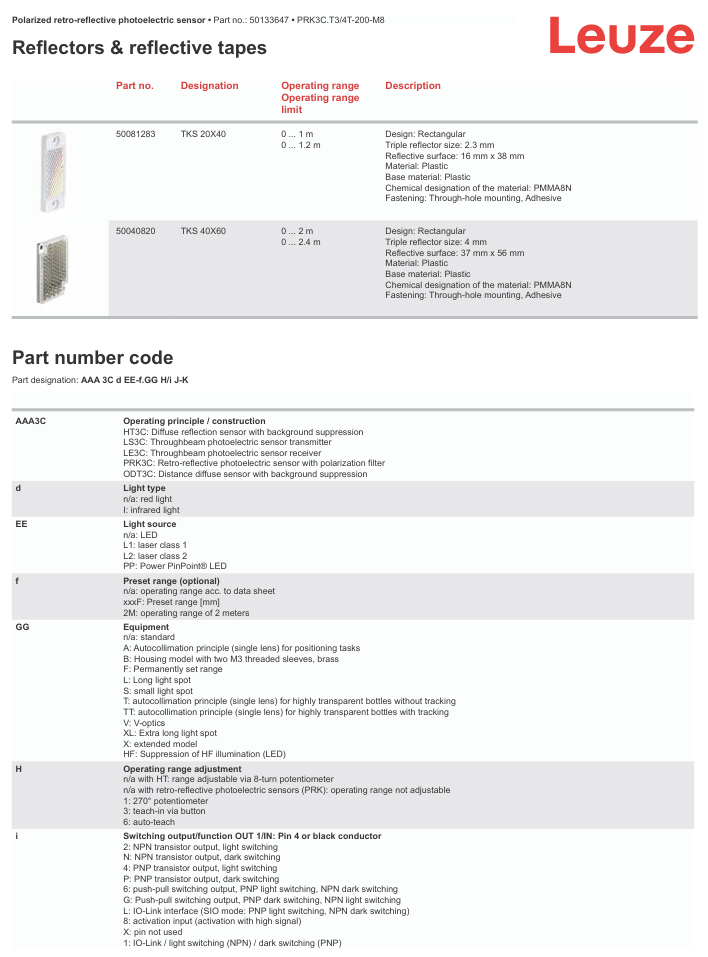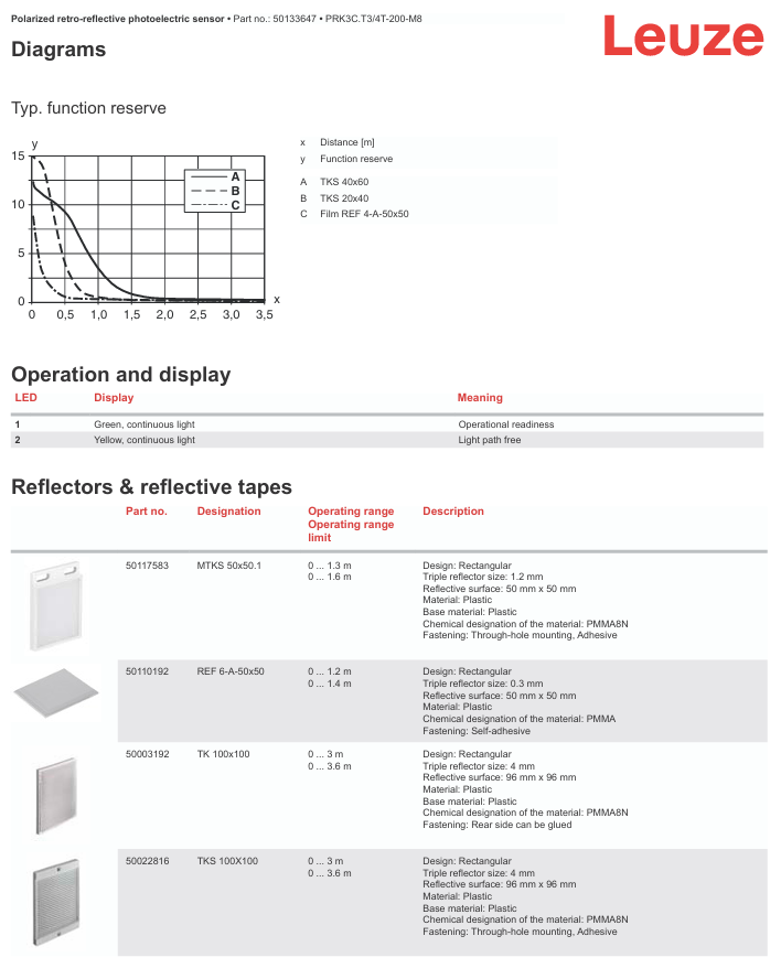 Sensores fotoeléctricos retrorreflectivos LEUZE PRK3C.T3/4T-200-M8 en stock